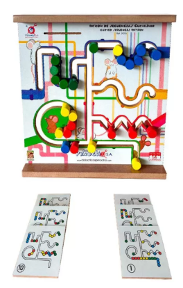Descripción: Patrón de secuencias elaborado en madera MDF con impresión serigráfica a base de tintas UV no tóxicas. Compuesto por 1 tablero, 6 tarjetas con gráficos en ambas caras (12 gráficos, 1 por cara) con impresión serigráfica en policromía a base de tintas UV no tóxicas y 24 pines (6 amarillos, 6 rojos, 6 verdes y 6 azules). Instructivo descargable por código QR.